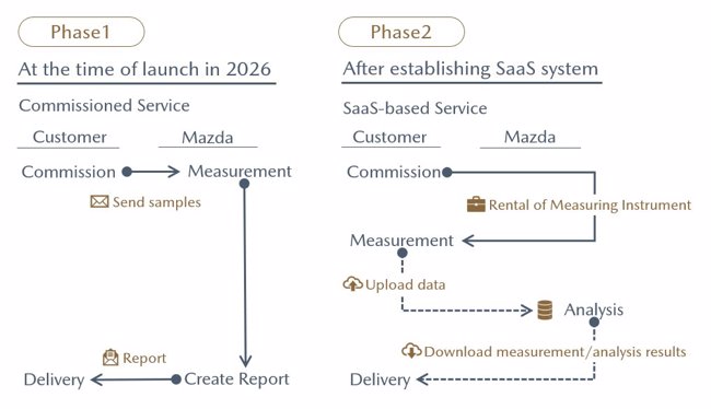 Mazda onderzoekt momenteel de commerciële haalbaarheid van een model waarbij partnerbedrijven monsters aanleveren die door Mazda’s eigen technologie worden geanalyseerd. De resultaten worden in een rapport teruggekoppeld. De officiële lancering van deze evaluatiedienst is gepland voor 2026, met later een overstap naar een cloudgebaseerd SaaS*-model.